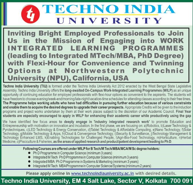 The Ph.D programme is a post-graduate programme focussed on original research, which generally results in publications in premier conferences or journals. Students usually study some courses in the first few semesters (course work required can vary based on student background), and finally dedicate themselves completely to research. These courses are the same as the the set of electives offered in the corresponding M. Tech programme.Techno India University (TIU) offers PhD programme for a huge number of engineering disciplines namely Civil Engineering, Computer Science and Engineering, Electrical Engineering, Mechanical Engineering, Chemical Engineering, Bio Technology, Electronics and Communication Engineering, Food Technology, Electronics and Instrumentation Engineering, Information Technology, Bio Medical Engineering and others. Besides Engineering, TIU also offers PhD programme for Science and Management post-graduates. This academic programme is of 5 years. Strenghened by its sound research base and state-of-the-art infrastructure, TIU provides its PhD students some fabulous facilities such as studying and working under nationally and internationally renowned researchers, actively participating in research conferences, seminars and workshops overseas, etc.TIU offers PhD in two forms - in independent form and in integrated form. The integrated form of PhD is a new innovative course offered by TIU which combines Mtech programme and PhD programme in each and every Engineering, Science and Management course taught at TIU. The broad objectives of these PhD programmes is not only to keep pace with the expanding frontiers of knowledge but also to provide research training relevant to the present social and economic objectives of the country. TIU also encourages research in interdisciplinary areas through system of joint supervision and interdepartmental group activities. The presence of a strong research oriented faculty provides excellent opportunities for such programme.TIU undertakes sponsored research and development projects from industrial and other organizations in public as well as private sector.